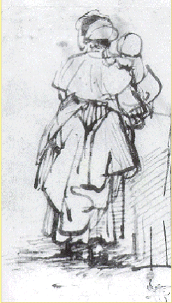 Картины и гравюры Рембрандта гораздо шире известны публике, нежели его рисунки, остававшиеся на протяжении долгого времени предметом интересов небольшого круга собирателей и знатоков. Между тем фигура Рембрандта-рисовальщика ни в чем не уступает Рембрандту-живописцу или офортисту. Рисунки мастера, сохранившиеся в огромном количестве — около 1700 листов, составляют автономную область его творчества. И одной из самых замечательных особенностей рембрандтовских рисунков является их способность делать зрителя свидетелем и соучастником рождения художественной мысли гениального мастера. К числу таких листов относится и небольшая зарисовка „Женщина с ребенком"(1650-е гг. БУМАГА, БИСТР, ПЕРО. 11,1 х 9,7).
