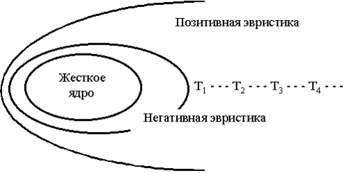 В программу входит негативная эвристика , которую составляет совокупность вспомогательных гипотез, которые предохраняют ее ядро от фальсификации, от опровергающих фактов [1]. Вся изобретательность направлена на его артикуляцию и разработку поддерживающих ядро гипотез (так называемый “защитный пояс”). Этот "защитный пояс" программы приникает на себя огонь критических аргументов. Кольцо вспомогательных гипотез призвано сдерживать атаки контролирующих проб и всячески защищать и консолидировать ядро. То есть это своего рода методологические правила, некоторые из которых указывают, каких путей следует избегать [3].