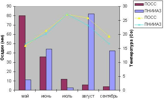 Рисунок показывает, что период формирования волокна (август-сентябрь) в Буденновске отличался крайней засушливостью и повышенными температурами.