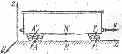 В отличие от классической механики, в специальной теории относительности одновременность двух событий, происходящих в разных точках пространства, относительна: события, одновременные в одной инерциальной системе отсчёта, не одновременны в других инерциальных системах1, движущихся относительно первой. На рисунке (см. ниже) расположена схема эксперимента, который это иллюстрирует. Система отсчета K связана с Землёй, система K’ — с вагоном, движущимся относительно Земли прямолинейно и равномерно со скоростью v. На Земле и в вагоне отмечены точки А, М, В и соответственно А’, M’ и В’, причем АМ=МВ и А’M’=M’B’. В момент, когда указанные точки совпадают, в точках А и В происходят события — ударяют две молнии. В системе К сигналы от обоих вспышек придут в точку М одновременно, так как АМ=МВ, и скорость света одинакова во всех направлениях. В системе К’, связанной с вагоном, сигнал из точки В’ придет в точку M’ раньше, чем из точки А’, ибо скорость света одинакова во всех направлениях, но М’ движется навстречу сигналу пущенному из точки B’ и удаляется от сигнала, пущенного из точки А’. Значит, события в точках А’ и B’ не одновременны: события в точке B’ произошло раньше, чем в точке A’. Если бы вагон двигался в обратном направлении, то получился бы обратный результат.