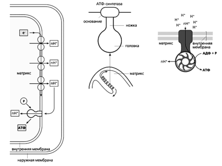 Фермент АТФ-синтетаза, катализирующий образование АТФ из АДФ и неорганического фосфата, представляет собой встроенное во внутреннюю мембрану грибовидное тельце с каналом в центре. Когда ион Н+ прорывается по этому каналу в матрикс, энергия протонного тока идет на синтез АТФ. Других путей возвращения в матрикс у протона нет, поскольку в нормальном состоянии внутренняя мембрана непроницаема для ионов. Процесс синтеза АТФ за счет энергии переноса электронов называется окислительным фосфорилированием.