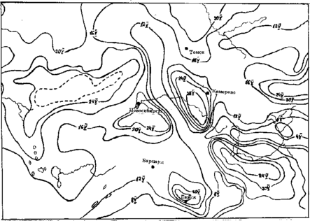 Считалось, что эта неравномерность проявляется, в основном, благодаря особенностям рельефа, а на равнине, вдали от гор и морских побережий, изофены будут идти более или менее равномерно. Но еще А.А. Браунер установил, что одни и те же виды прилетают на севере Украины раньше, чем в Бессарабии и Причерноморье. Это связывалось с миграцией их по разным пролетным путям (Пузанов, 1957). Г. Гроте обратил внимание на то, что в Аскании-Нова птицы появляются на 2 недели позже, чем на Черноморском побережье и на Днепре, где пролетет основная масса водоплавающих (Соколов, 1926). К. Бречер (1935) установил, что кукушка в Средней Европе быстрее продвигается вдоль рек, даже на равнине. У. Сливинская (1938) пишет, что ход изопиптез может зависеть не только от особенностей ландшафта, но и от пути пролета птицы. Постепенно с появлением более крупномасштабных фенокарт эта мысль углубляется и развивается. На картах С.И. Хомченко (1972) по прилету кукушки (Cuculus canorus) на юге Западной Сибири изофены образуют глубокие выступы, которые он называет "путями проникновения" (рис. 2). М.А. Родионов (1978) писал, что птицы вырываются вперед по экологическим руслам пролета. И, наконец, В.В. Серебряков (1978) предложил определять по авифенологическим картам пролетные пути.