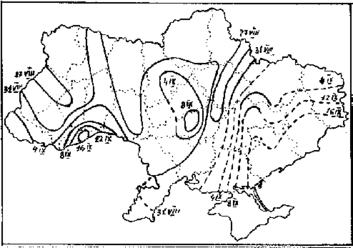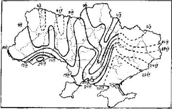 Рис. 3. Карта начала осенней миграции белого аиста на территории Украины (по: Грищенко, Серебряков, 1992).