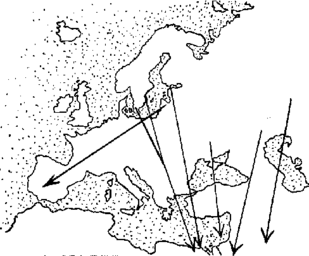 Рис. 3. Пролетные пути европейской популяции серого журавля (по: Nrrevang, 1959).