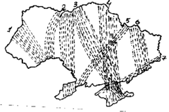 Рассмотрим в заключение образование пролетных путей на территории одного региона на примере Украины. Схемы их размещения представлены на рис. 4 и 6. Карта для осенней миграции составлена по нашим данным (Грищенко, 1994б), для весенней - по расположению миграционных потоков на фенологических картах прилета ряда видов птиц (Грищенко, Серебряков, 1988, 1990, 1992, 1993а, 1993б; Серебряков, 1989; Serebryakov et al., 1991). Существование и размещение всех их может быть объяснено действием описанных выше факторов.
