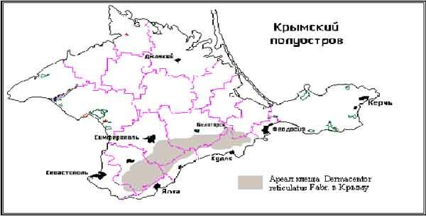 Ареал D. marginatus занимает практически весь полуостров, за исключением яйл (безлесных высокогорных крымских лугов) и лесных массивов, примыкающих к яйлам. Ареал D. reticulatus образует в Крыму географически изолированную от основного ареала популяцию, ограниченную горно-лесной зоной (Рис. 1).