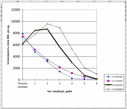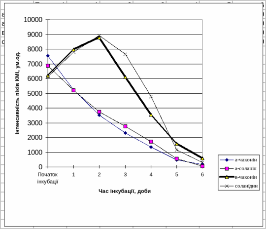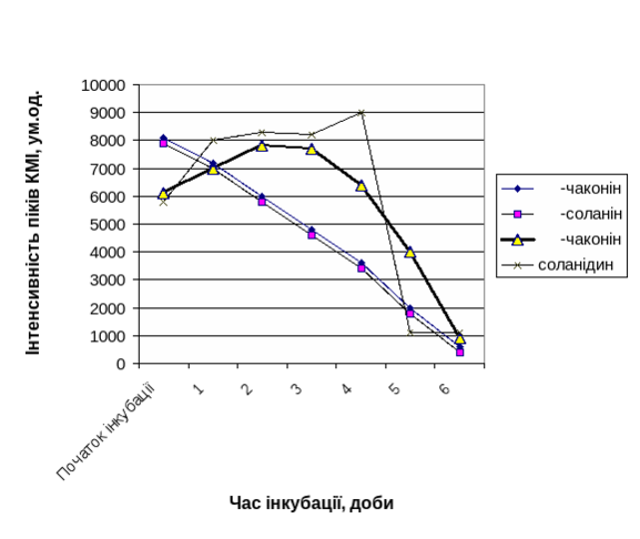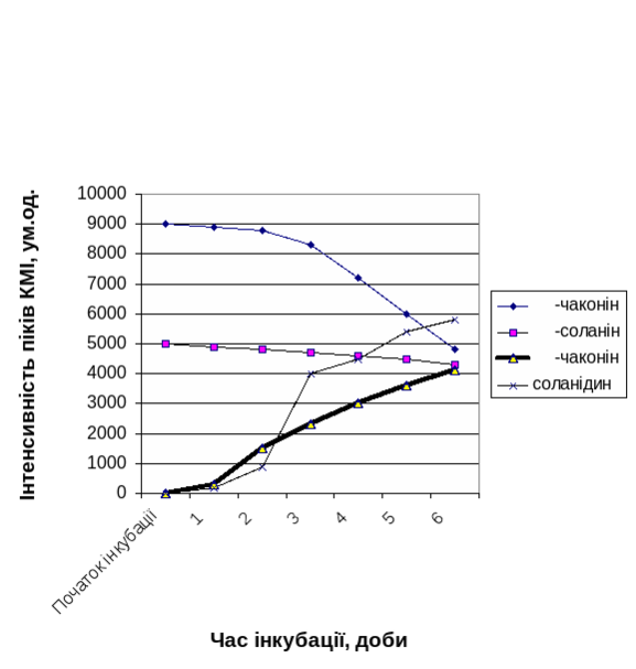 Із рис.7 легко бачити, що найвища швидкість гідролітичної деструкції як a–соланіна, так і a–чаконіна в середовищі інкубації притаманна малостійкому сортові картоплі Молодіжна; порівняно стійкий сорт Світанок київський характеризуються повільним зменшенням кількості нативних молекул глікоалкалоїдів в середовищі на протязі інкубації (рис.8). Середньостійкому сорту Невська притаманні проміжні кінетичні параметри гідролітичної деструкції глікоалкалоїдів, які є своєрідною комбінацією із відповідних параметрів стійкого та нестійкого до фітопатогенів сортів (рис.9).
