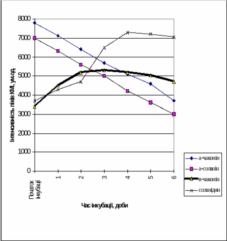 Таким чином з рис.7-11 випливає, що динамiка накопичення в модельнiй системi в процесi iнкубацii b-чаконiна безпосередньо корелює з рiвнем стiйкостi досліджених сортів картоплi по вiдношенню до фітопатогенів. Умовний ряд стiйкостi зазначених сортiв до збудників фітофторозу та фузаріозу, побудований на пiдставi мас-спектрометричних досліджень, в певному наближенні співпадає з аналогічним рядом, отриманим за допомогою класичних методів: