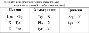 В желудочно-кишечном тракте пищевые белки распадаются на аминокислоты при участи пищеварительных протеолитических ферментов – пептидогидролаз. Эта группа ферментов различающихся по субстратной специфичности: каждый из этих ферментов предпочтительно (т.е. с наибольшей скоростью) гидролизует пептидные связи (рис.1), образованные определёнными аминокислотами. В результате совместного действия всех пищеварительных пептидогидролаз белки пищи полностью распадаются на аминокислоты. Таким путём организм получает мономеры для синтеза собственных белков.