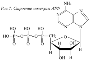 свобождение значительной энергии при гидролизе дало основание ввести специальный термин для фосфоорганических веществ – макроэнергетические. Молекула АТФ содержит две высокоэнергетические (макроэнергетические) связи (рис.7).