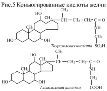В составе желчи содержатся коньюгированные желчные кислоты (Рис.5) – гликохолевая и таурохолевая. Эти кислоты обладают амфифильными свойствами. На поверхности раздела жир-вода они ориентируются таким образом, что гидрофобная циклическая часть оказывается погружённой в жир, а гидрофильная боковая цепь – в водную фазу. В результате образуется стабильная эмульсия.