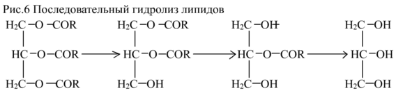 од действием липазы идёт гидролиз жиров, в ходе которого жирные кислоты отщепляются от триацилглицерина одна за другой, сначала от α-углеродных атомов, потом – от β-углеродного атома (Рис. 6)