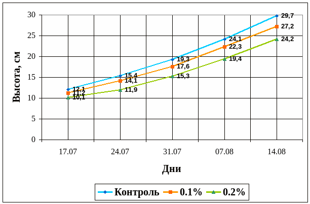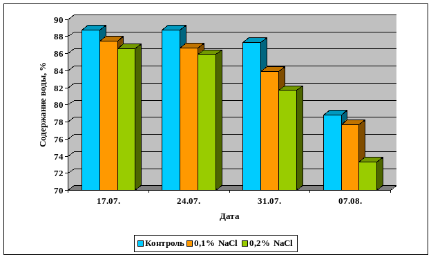 Для растений, выращенных на почве с 0,2% засолением NaCl, эти цифры составили от 2,2 до 5,6%. В среднем оводненность растений, выращенных при 0,1 % засолении, на 2,3% ниже контрольных, а при 0,2 М - на 4,8%.