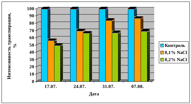 Содержание воды и водоудерживающая способность – это не единственные показатели водного обмена растений. Более важным критерием является интенсивность транспирации. В таблице 4 и на рисунке 4 приведены данные по влиянию уровня засоления на этот показатель.