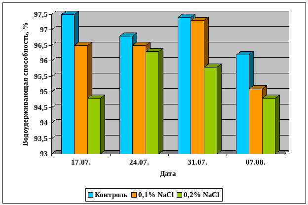 Так при концентрации соли 0,1%, водоудерживающая способность уменьшилась от 0,1 до 1,1% по сравнению с контролем, а при 0,2% - от 0,5 до 2,7%, что можно видеть на рисунке 3. В среднем водоудерживающая способность понизилась на 0,6% при 0,1% концентрации NaCl; и на 1,6% при 0,2% засолении.