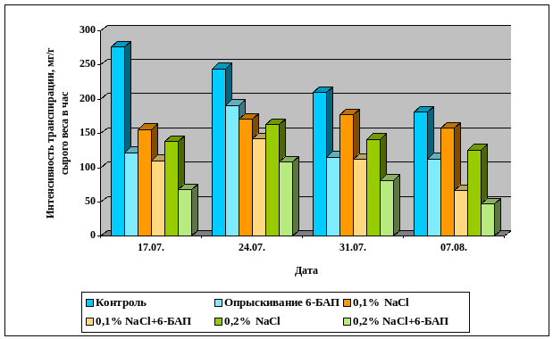 3. Обработка 6-БАП снимает угнетающее действие солей и способствует нормализации ростовых процессов, увеличению содержания воды и водоудерживающей способности, а также снижению интенсивности транспирации, что говорит о повышении адаптивных возможностей растительного организма.