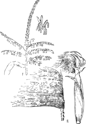 1 - метелка, 2 - лист; 3 - рыльца, 4 - початок, 5 - листовая обертка початка,