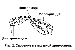 В Метафазе завершается формирование веретена деления. Хромосомы перестают двигаться и выстраиваются по экватору веретена, образуя экваториальную пластинку. При этом хорошо видно, что каждая хромосома, состоящая из двух хроматид, имеет перетяжку - центромеру (рис 2). Хромосомы своими центромерами прикрепляются к нитям веретена деления. После деления центромеры каждая хроматида становится самостоятельной дочерней хромосомой. Синтез белка снижен на 20-30% по сравнению с интерфазой. На этой стадии М. клетки наиб. чувствительны к холоду, колхицину, его производным и др. агентам, воздействие к-рых разрушает веретено деления и приводит к пекращению деления клеток (К-митоз). При низких дозах повреждающих агентов нормальное течение М. восстанавливается через несколько часов после их воздействи; более высокие дозы приводят либо к гибели клетки, либо к ее полиплоидизации.