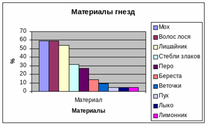 Процентное соотношение материалов гнезда (общее количество гнезд: 22; 1%= 0,22 )