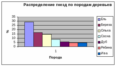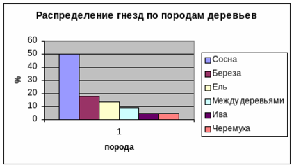 Распределение гнезд по породам деревьев (общее количество измерений: 380; 1% = 3,8)