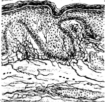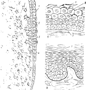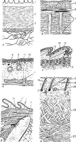 У млекопитающих (рис. 1, е), кроме китов, к. имеет придатки — волосы, ногти, сальные и потовые железы. Рыхло-волокнистый богатый сосудами слой дермы вдается в эпидермис в виде соединительнотканных сосочков, что способствует лучшему питанию эпидермального пласта клеток, лишенного кровеносных сосудов; этот слой дермы называется сосочковым (stratum papillare). Между сосочками дермы находятся выросты эпителиального пласта, называемые эпидермальными отростками.