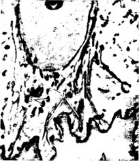 пидермис состоит из пяти слоев: назального, шиповатого, зернистого, блестящего, рогового. Базальный слой (stratum basalе) представлен одним рядом палисадообразно расположенных на базальной мембране призматических клеток (базальных эпидермоцитов — epidermocytus basalis) с ядрами, ориентированными перпендикулярно баззльной мембране. В их цитоплазме имеется большое количество тончайших нитей — тонофиламентов, собирающихся в пучки— тонофибриллы (опорные волоконца), видимые уже в световом микроскопе, а также глыбки (зерна) пигмента меланина (рис. 3). Базальные клетки закреплены и базальной мембране пальпеобразными выростами с полудесмосомами. Соседние эпидермоциты связаны друг с другом взаимопроникающими впячиваниями и десмосомами. Размер межклеточных промежутков около 10 мм.Базальная мембрана имеет толщину 25—35 мм состоит из узкой осмиофильной цитоплазматической мембраны базальных клеток и более широкой собственно базальной мембраны средней электронной плотности, от к-рой к цитоплазматическим отделам идут тонкие перемычки. В цитоплазматичсской мембране имеются полу-десмосомы, к к-рым подходят тонофибриллы.