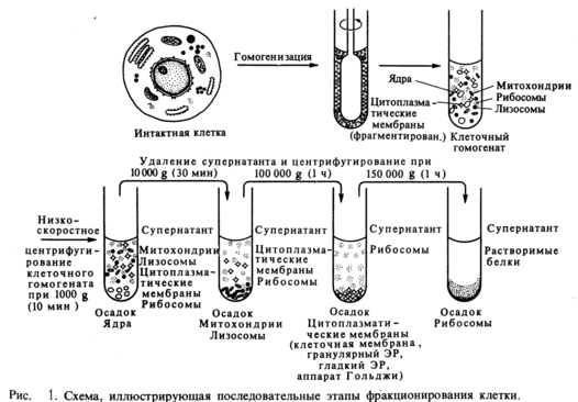 На следующем этапе клеточный гомогенат подвергают ряду центрифугирований, скорость и продолжительность которых всякий раз возрастает; этот процесс называется дифференциальным центрифугированием. Разные органеллы клетки осаждаются на дне центрифужных пробирок при различных скоростях центрифугирования, что зависит от размеров, плотности и формы органелл. Образующийся осадок можно отобрать и исследовать. Быстрее всех осаждаются такие крупные и плотные структуры, как ядра, а для осаждения более мелких и менее плотных структур, таких, как пузырьки эндоплазматического ретикулума, требуются более высокие скорости и более длительное время. Поэтому при низких скоростях центрифугирования ядра осаждаются, а другие клеточные органеллы остаются в суспензии. При более высоких скоростях осаждаются митохондрии и лизосомы, а при длительном центрифугировании и очень высоких скоростях в осадок выпадают даже такие мелкие частицы, как рибосомы. Осадки можно исследовать с помощью электронного микроскопа, чтобы определить чистоту полученных фракций. Все фракции до некоторой степени загрязнены другими органеллами. Если тем не менее удается добиться достаточной чистоты фракций, то их подвергают затем биохимическому анализу, чтобы определить химический состав и ферментативную активность выделенных органелл.