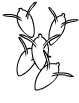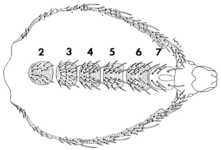 амца - шесть, причём шестой и восьмой тергиты слиты, а восьмой вошёл в состав полового аппарата. Стерниты- такие же хитиновые пластинки с брюшной стороны (см. рис.). У самки их также на один больше, чем у самца, и у представителей каждого пола не развиты первый, второй, седьмой и восьмой стерниты.
