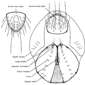 Dorsal anal plate - дорсальная анальная пластинка; Ventral anal plate - вентральная анальная пластинка; Eighth targite - восьмой тергит; Long bristles - длинные шипы; Sensilla trichodea - чувствительный волосок; Thorn bristles - колючие шипы; Vulva - вульва; Vaginal plate - влагалищная пластинка.