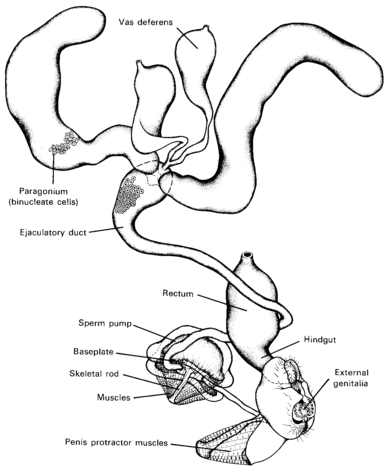 нутренний половой аппарат самца включает в себя парный семенник, парные семенные пузырьки, придаточные железы, непарный семявыносящий проток, непарный bulbus ejaculatorius, непарный семяизвергательный канал. Семенники представляют собой свёрнутые трубки, переходящие в семенные пузырьки, которые переходят в семенные канальца, соединяющиеся непосредственно перед впадением в семявыносящий проток. Семявыносящий проток впадает в bulbus ejaculatorius, который играет роль насоса, выталкивающего сперму из семявыносящего протока и выбрасывающего её наружу через семяизвергательный канал, который открывается в основание пениса.