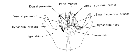аружные половые органы самца имеют более сложное строение. Они состоят из генитальной пластинки и пениса с прилегающими к нему частями. Генитальная пластинка представляет собой подковообразное хитиновое образование. Внутри неё открывается анальное отверстие, по бокам которого латерально расположены две анальные пластинки. С брюшной стороны генитальная пластинка несёт две пары отростков, к которым причленяется пенис с его придатками. Собственно пенис имеет вид ложкообразной хитиновой пластинки, несущей краю ряд хитиновых зубцов: