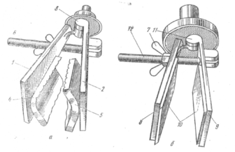 Исследования по определению усилий отрыва внутренностей и их деформации проводили на автоматическом прессе IS-5000 японской фирмы «Шимардзу». Для захвата рыбы за голову и туловище было спроектировано приспособление, показанное на рис. 12. Захват для головы (рис. 12, а) состоит из двух планок 1, 2, соединенных между собой шарниром 3. К планкам приварены щеки 4 и 5, имеющие криволинейные поверхности с насечками. Зажим головы рыбы осуществляется посредством сближения щек за счет винта 6 и гайки 7. Захват для туловища (рис. 12, б) состоит из двух планок 8, 9, облицованных резиной 10. Планки соединяются шарнирно 11 и сближаются посредством винта 12. В планках 8, 9 имеются отверстия, через которые пропускается игла, прокалывающая рыбу для более надежной ее фиксации. Хвостовые захваты имеют цилиндрическую форму. Хвостовые захваты для туловища рыбы крепятся к траверсе, хвостовые захваты для головы — к штанге, присоединенной к тензометрической головке.