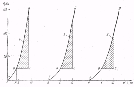 з рис. 10 видно, что чем меньше сопротивляемость сжатию тела рыбы, тем меньше угол наклона кривой к оси абсцисс, а следовательно, меньше и работа сжатия. Так как из трех видов рыб (ставриды, скумбрии, сардинеллы) наибольшая работа затрачивается на деформацию тела ставриды, то, следовательно, и жесткость тела ставриды будет наибольшей. Для некоторых видов рыб, например кильки, определить экспериментально работу сжатия при 5-миллиметровой деформации практически невозможно, потому что вся толщина тела рыбы не превышает 5 мм. В этом случае для получения соизмеримых значений жесткости можно пересчитать работу при 5-милиметровой, на работу при 5-миллиметровой деформации. На рис. 11 показана работа при деформации λ1 и λ.