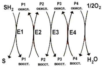 Перенос электронов и протонов с участием промежуточных переносчиков. SH2 - исходный донор протонов и электронов; P - промежуточные переносчики; E1, E2, E3, E4 - ферменты окислительно-восстановительных реакций