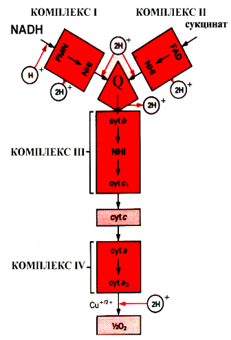 Промежуточными переносчиками в дыхательной цепи у высших организмов являются коферменты: NAD+ (никотинамид-адениндинуклеотид), FAD и FMN (флавинадениндинуклеотид и флавинмононуклеотид), кофермент Q (CoQ), семейство гемсодержащих белков - цитохромов (обозначаемых как цитохромы b, С1, С, А, А3) и белки, содержащие негеминовое железо. Все участники этой цепи разделены на четыре окислительно-восстановительные системы, связанные убихиноном (CoQ) и цитохромом С. Процесс начинается с переноса протонов и электронов от окисляемого субстрата на коферменты NAD+ или FAD. Это определяется тем, является ли дегидрогеназа, катализирующая первую стадию, NAD - зависимой или FAD - зависимой. Если процесс начинается с NAD+ , то следующим переносчиком будет FMN.