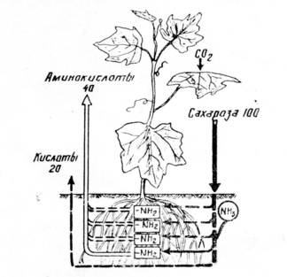 Круговорот веществ в растении осуществляется путем участия воды. Координация деятельности органоидов в клетках и органах растения связана с наличием воды, следовательно, она в значительной степени определяет функциональную целостность организма. Опытами академика А. Л. Курсанова (1960) установлено, что, с одной стороны, деятельность корневой системы растения связана с теми веществами, которые образуются в листьях, иначе говоря с деятельностью листьев и стебля, с другой стороны, нормальное функционирование листьев, их деятельность зависит от работы корневой системы. Различные вещества, поступившие из почвы в корень, передвигаются в виде пасоки в надземные органы, в том числе и в листья, где они используются на синтез новых веществ, необходимых для построения тела растения, для нормального функционирования его. Метаболиты, образовавшиеся в их листьях (сахара и другие вещества), перемещаются нисходящим током в подземные органы (корни), где они необходимы для поддержания их деятельности, для обеспечения жизненных процессов, тем самым обеспечивается связь между органами растения.