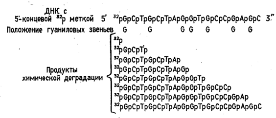 -32Р-АТР и Т4-полинуклеотидкиназы. Таким образом, в результате химической деградации получается набор фрагментов ДНК различной длины. Длины этих фрагментов соответствуют положению мономерных звеньев того типа, который подвергался модификации. Концевая радиоактивная метка служит точкой отсчета при определении длины продуктов химической деградации ДНК (рис. 2)