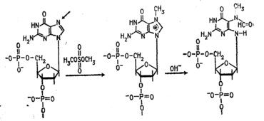 Набор реакций, применяемых для расщепления ДНК по мономерным звеньям определенного типа достаточно велик и постоянно пополняется: по остаткам гуанина – обработка диметилсульфатом (рис. 3); по остаткам аденина и гуанина – апуринизация 50%-ной муравьиной кислотой (по Бартону); по остаткам аденина и цитозина – расщепление гетероциклических оснований под действием 1,2 н. гидроксида натрия и по остаткам тимидина и цитозина – обработка гидразином (рис. 4).