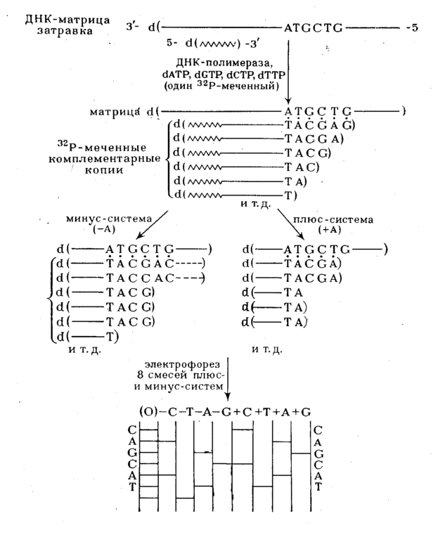 Ферментативный синтез олиго(поли)дезоксирибонуклеотидов с помощью ДНК-полимераз, заключающийся в копировании матричного полинуклеотида нашел блестящее применение в качестве одного из двух наиболее эффективных методов установления первичной структуры ДНК. Метод состоит в получении блоков-копий полидезоксирибонуклеотида, структура которого изучается. При этом обязательным является выполнение двух условий. Во-первых, копирование должно проводиться, начиная с определенного мономерного звена. Во-вторых, синтез копий следует осуществлять четыре раза, каждый раз останавливая его поочередно на каком-либо одном из четырех мономёрных звеньев (A, G, С или Т), иначе говоря, стремятся получить полный набор "комплементационно отраженных" копий исследуемого полинуклеотида, образование которых прекратилось в каждом из мест расположения одного из четырех мономерных звеньев нуклеиновой кислоты. Определение длины каждой копии позволяет установить положение данного мономерного звена в цепи исследуемого полинуклеотида. Длина копии определяется фракционированием в полиакриламидном геле. Этот метод, таким образом, так же как и метод, основанный на модификации оснований позволяет получать информацию о положении определенного мономерного звена в цепи полинуклеотида прямо после фракционирования.