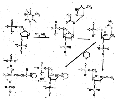 Рисунок 4 Реакция селективного расщепления по остаткам тимидина и цитозина.