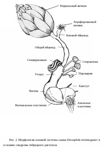Стерильность является следствием потери зародышевых клеток на стадиях раннего эмбриогенеза и личинки (Niki, Chigusa, 1986). Для P-M гибридного дисгенеза гибель зародышевых клеток