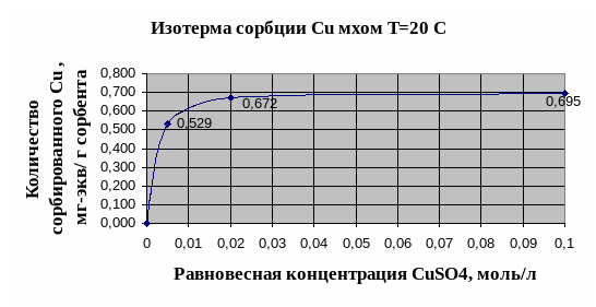 Изотермы сорбции – это кривые, показывающие зависимость количества сорбированного вещества (мг-экв) в расчете на 1 г сорбента от равновесной концентрации этого вещества в моль/л.