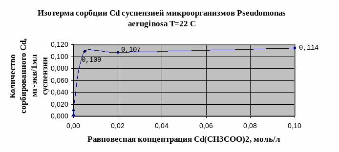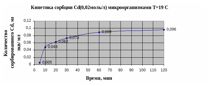 Основываясь на результатах эксперимента можно говорить о том, что исследуемый штам микроорганизмов Pseudomonas aeruginosa В7 обладает сорбционными свойствами по отношению к тяжелым металлам. Так, по отношению к кадмию в результате исследований (п.2.1.5) сорбционная емкость микроорганизмов – 0,114 мг-экв/мл суспензии, по меди – 0,29 мг-экв/мл суспензии.