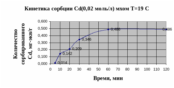 По виду кинетических кривых можно говорить о том, что в системе «мох-раствор металла» достаточно быстро устанавливается равновесное состояние (рис.2.3, 2.4.). Так, уже через полчаса сорбируется 91% ионов меди и 72% кадмия. Также по виду кривой 2.3. можно говорить о присутствии у мха двух активных центров связывания ионов металла, об этом свидетельствуют две точки перегиба на кривой, т.е. основной вклад в сорбцию вносит ионообменная сорбция, а не физическая, т.к. в случае физической сорбции точек перегиба бы не было.