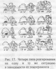Надо отметить, что представители основных типов темпераментов в чистом виде встречаются крайне редко как у животных, так и у человека. Гораздо чаще наблюдаются смешанные типы, позволяющие говорить о вариациях основных типов - меланхолика, холерика, сангвиника и флегматика. Поведенческие особенности четырех типов темпераментов в одной и той же критической ситуации хорошо иллюстрирует рисунок художника Бидструпа (рис. 17).