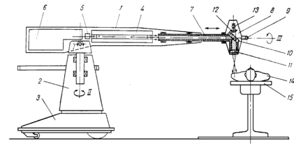 Îïåðàöèîííûé àïïàðàò ñîñòîèò èç ãîðèçîíòàëüíîãî ñòâîëà 1, óñòàíîâëåííîãî íà âåðòèêàëüíîé ñòîéêå 2. Ñòâîë ìîæåò ïîâîðà÷èâàòüñÿ âîêðóã ãîðèçîíòàëüíîé îñè I è âåðòèêàëüíîé îñè II.