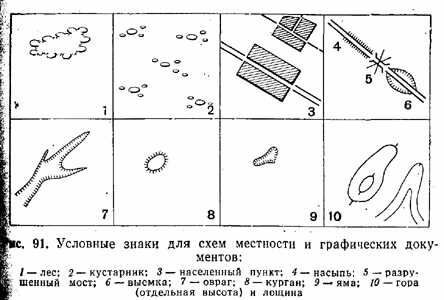 естные предметы изображаются на схеме топографическими условными знаками, возвышенности и углубления (высоты, котловины) — несколькими замкнутыми горизонталями, а хребты и лощины—обрывками горизонталей, вырисовывающих конфигурацию этих форм рельефа. При этом в целях ускорения работы начертания условных знаков некоторых местных предметов упрощают.