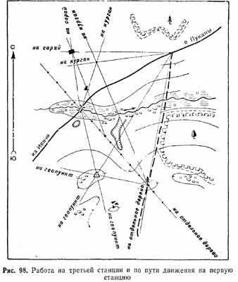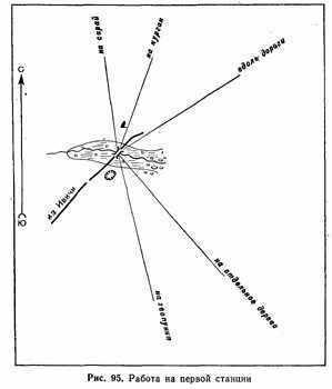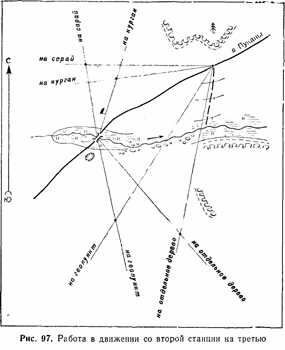 Съемка ведется обходом участка по дорогам, берегу реки, опушке леса, вдоль линии связи и т. п. Направления, по которым ведется съемка, называются ходовыми линиями, а точки, на которых определяюгся и прочерчиваются направления новых ходовых линий,—станциями.