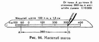 Имея такой масштаб, нет необходимости каждый раз переводить пары шагов в метры; достаточно отложить по масштабу пройденное число пар шагов, чтобы получить расстояние в масштабе съемки, которое и наносится на чертеж.