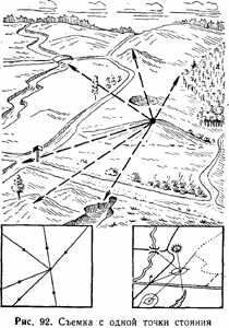 На лист бумаги наносят точку стояния так, чтобы снимаемый участок поместился на этом листе. Например, если мы стоим в центре снимаемого участка, то и точку стояния следует обозначить в центре листа бумаги; если стоим в одном из углов или на краю участка, то и точку на бумаге следует поставить в соответствующем углу или на краю листа бумаги. Затем, сориентировав лист бумаги относительно снимаемого участка, закрепляют его на каком-либо предмете (пне, перилах моста, бруствере окопа) и, не сбивая положения листа, проводят съемку.